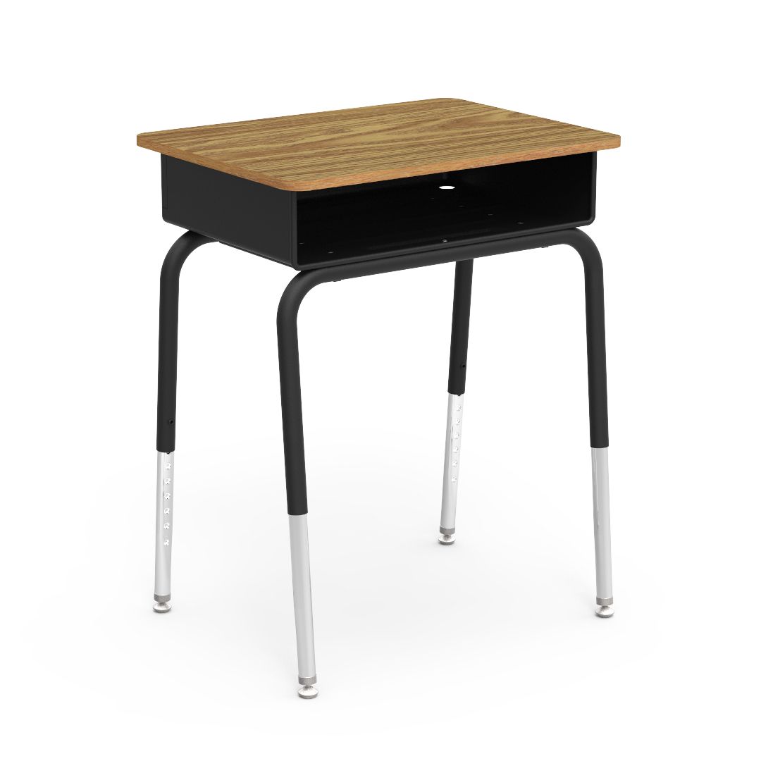 Adjustable-height desk with plastic open-front book box. 18″ x 24″ high-pressure laminate work surface.