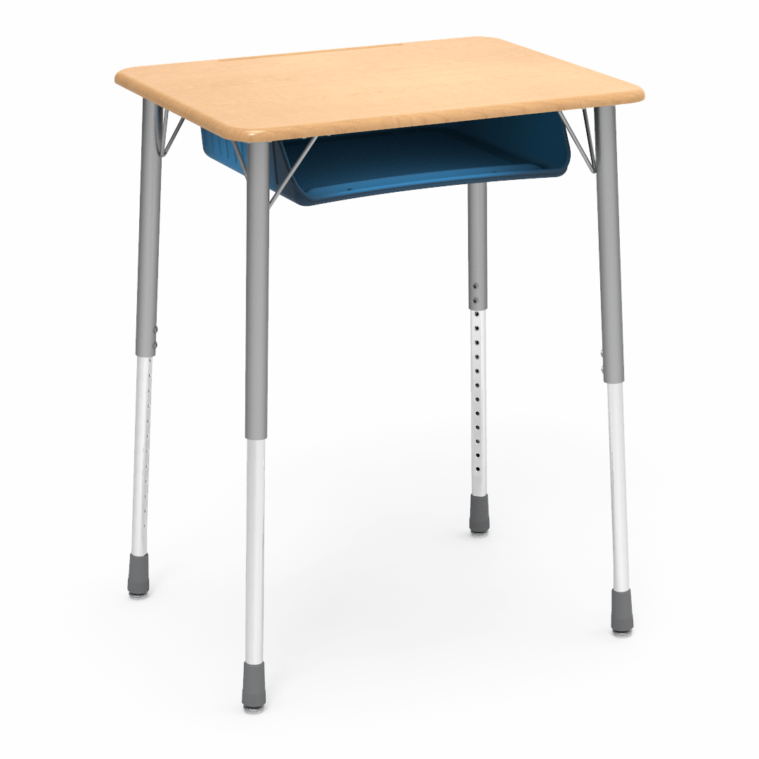 Adjustable-height desk with plastic open-front book box. 20″ x 261/8″ FRW™ hard plastic work surface.